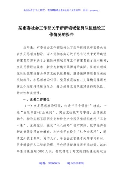 / 某市委社会工作部关于新新领域党员队伍建设工作情况的报告