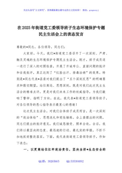 / 在2025年街道党工委领导班子生态环境保护专题民主生活会上的表态发言