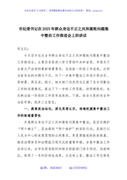 / 市纪委书记在2025年群众身边不正之风和腐败问题集中整治工作推进会上的讲话
