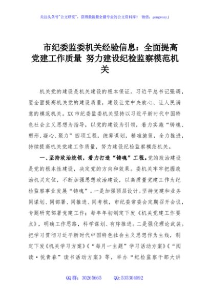 / 市纪委监委机关经验信息:全面提高党建工作质量 努力建设纪检监察模范机关