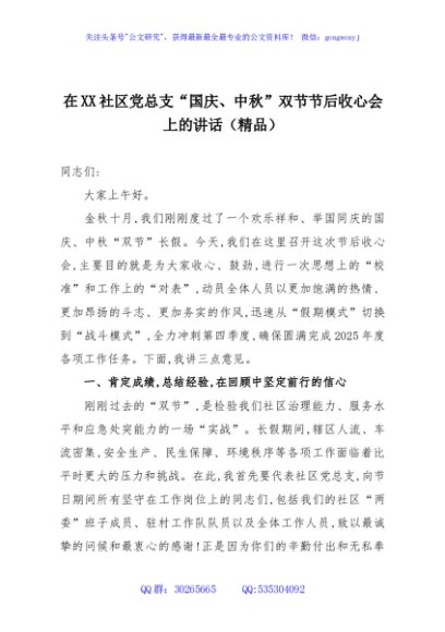 / 在XX社区党总支“国庆、中秋”双节节后收心会上的讲话(精品)