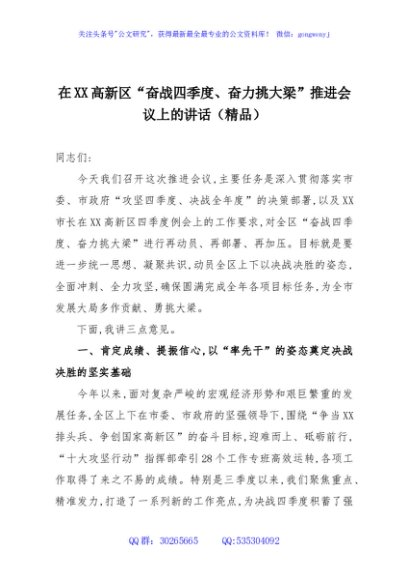 / 在XX高新区“奋战四季度、奋力挑大梁”推进会议上的讲话(精品)