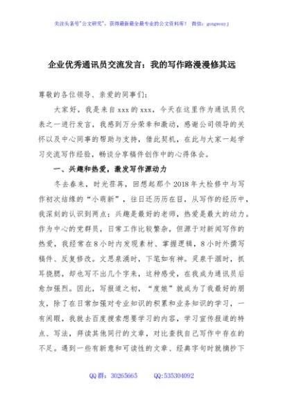 / 企业优秀通讯员交流发言:我的写作路漫漫修其远