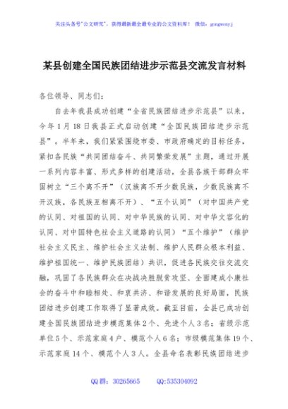 / 某县创建全国民族团结进步示范县交流发言材料