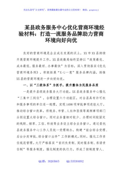 / 某县政务服务中心优化营商环境经验材料:打造一流服务品牌助力营商环境向好向优