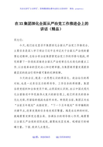 / 在XX集团深化全面从严治党工作推进会上的讲话(精品)