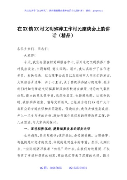 / 在XX镇XX村文明殡葬工作村民座谈会上的讲话(精品)
