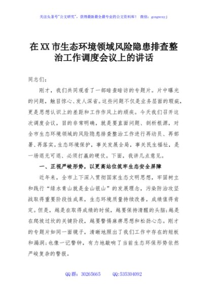 未生成预览图,长按二维码添加 在XX市生态环境领域风险隐患排查整治工作调度会议上的讲话 - 公文研究