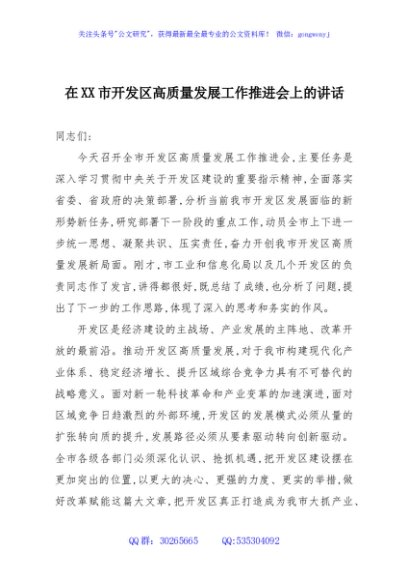 / 在XX市开发区高质量发展工作推进会上的讲话