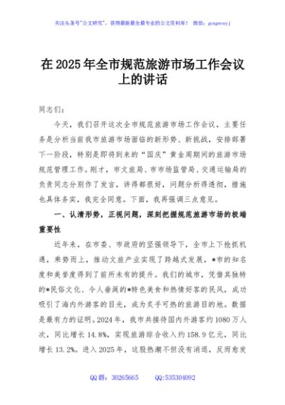 / 在2025年全市规范旅游市场工作会议上的讲话