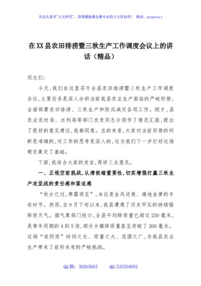 / 在XX县农田排涝暨三秋生产工作调度会议上的讲话(精品)