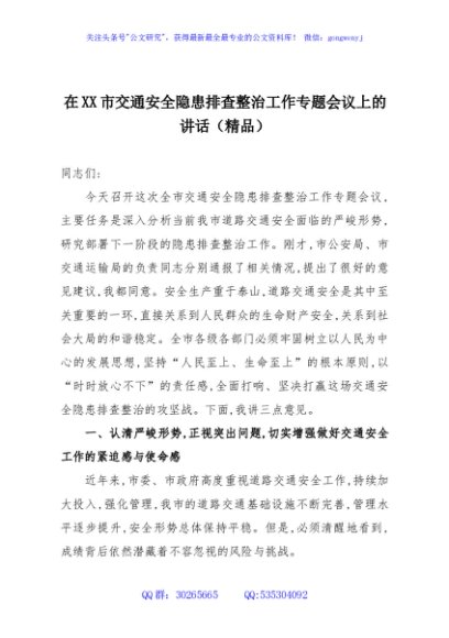 / 在XX市交通安全隐患排查整治工作专题会议上的讲话(精品)