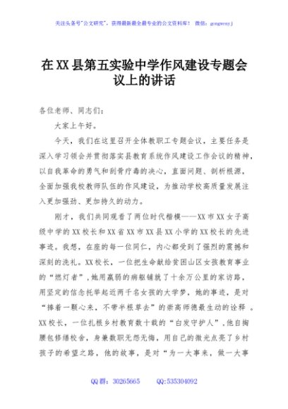 / 在XX县第五实验中学作风建设专题会议上的讲话