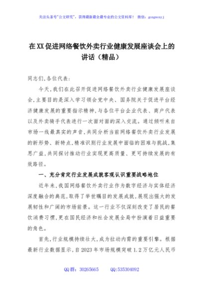 / 在XX促进网络餐饮外卖行业健康发展座谈会上的讲话(精品)