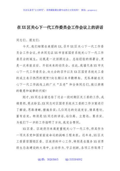 / 在XX区关心下一代工作委员会工作会议上的讲话
