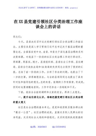 / 在XX县党建引领社区分类治理工作座谈会上的讲话