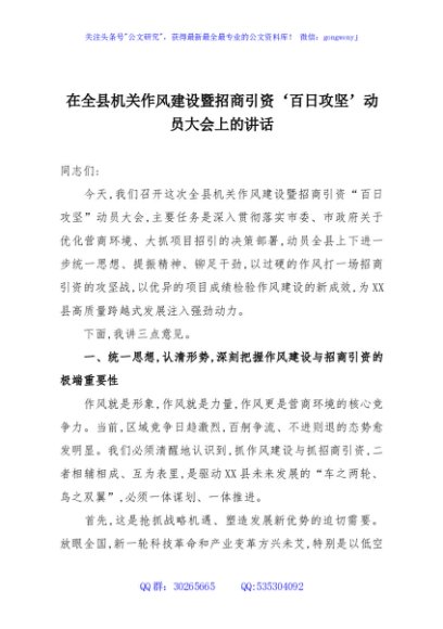 / 在全县机关作风建设暨招商引资‘百日攻坚’动员大会上的讲话