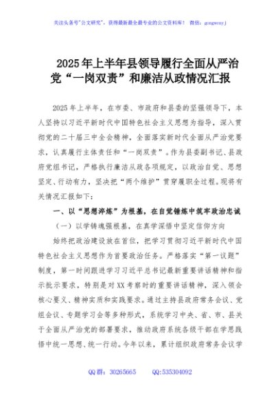 / 2025年上半年县领导履行全面从严治党“一岗双责”和廉洁从政情况汇报
