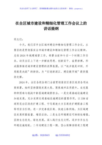 / 在全区城市建设和精细化管理工作会议上的讲话提纲