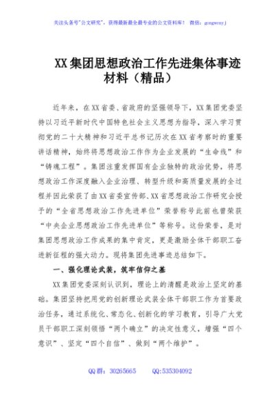 / XX集团思想政治工作先进集体事迹材料(精品)