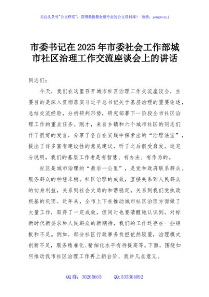 / 市委书记在2025年市委社会工作部城市社区治理工作交流座谈会上的讲话