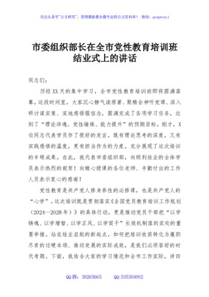 / 市委组织部长在全市党性教育培训班结业式上的讲话