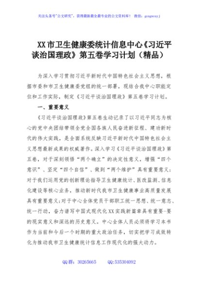 XX市卫生健康委统计信息中心《习近平谈治国理政》第五卷学习计划(精品)