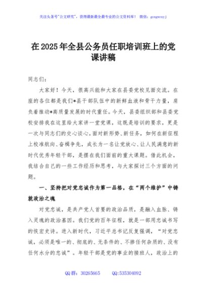 / 在2025年全县公务员任职培训班上的党课讲稿