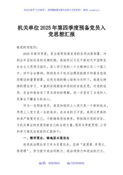 / 机关单位2025年第四季度预备党员入党思想汇报
