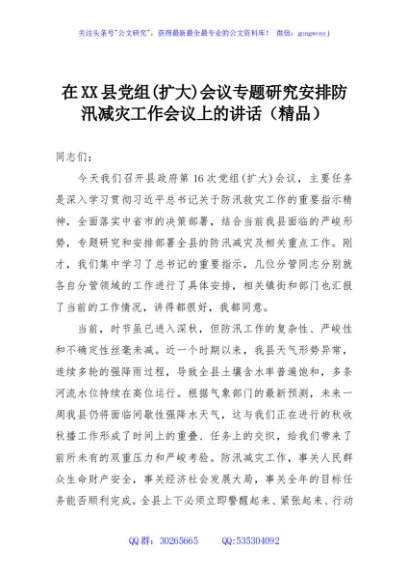 / 在XX县党组(扩大)会议专题研究安排防汛减灾工作会议上的讲话(精品)