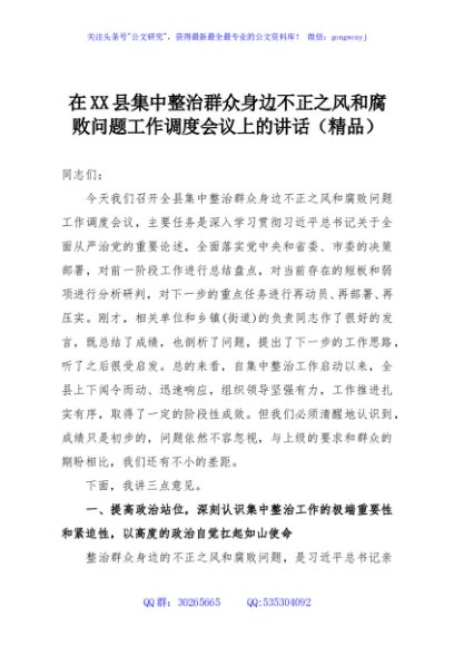 / 在XX县集中整治群众身边不正之风和腐败问题工作调度会议上的讲话(精品)