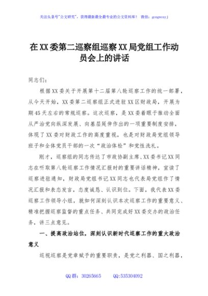 / 在XX委第二巡察组巡察XX局党组工作动员会上的讲话