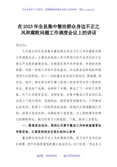 / 在2025年全县集中整治群众身边不正之风和腐败问题工作调度会议上的讲话