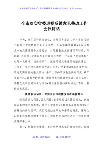 / 全市落实省委巡视反馈意见整改工作会议讲话