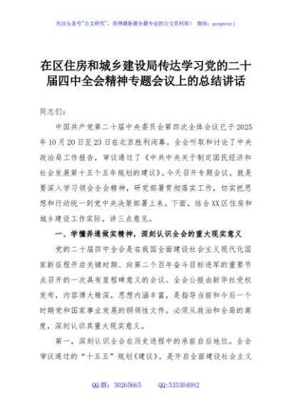 / 在区住房和城乡建设局传达学习党的二十届四中全会精神专题会议上的总结讲话