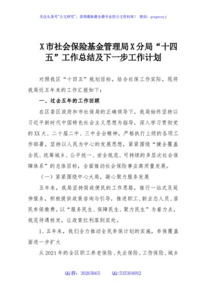 / X市社会保险基金管理局X分局“十四五”工作总结及下一步工作计划