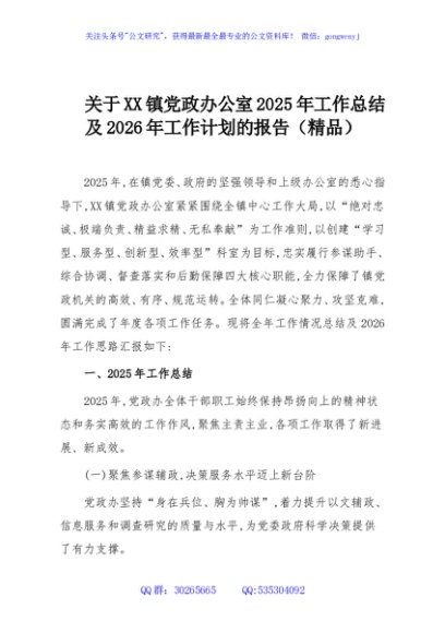 / 关于XX镇党政办公室2025年工作总结及2026年工作计划的报告(精品)