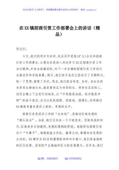 / 在XX镇招商引资工作部署会上的讲话(精品)