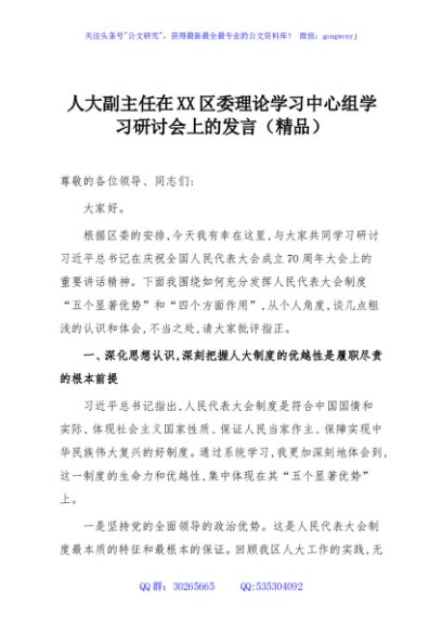 / 人大副主任在XX区委理论学习中心组学习研讨会上的发言(精品)