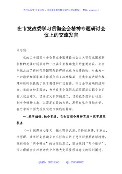 / 在市发改委学习贯彻全会精神专题研讨会议上的交流发言