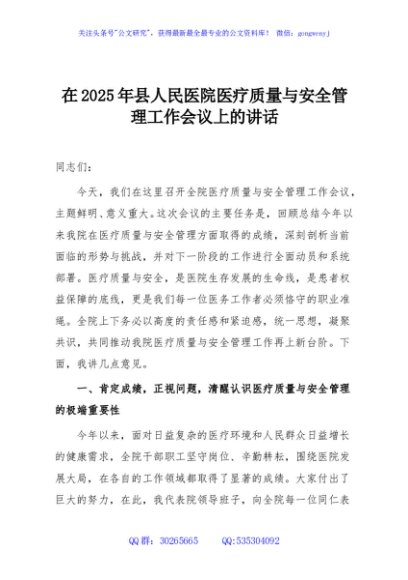 / 在2025年县人民医院医疗质量与安全管理工作会议上的讲话