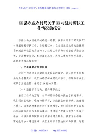 / XX县农业农村局关于XX村驻村帮扶工作情况的报告