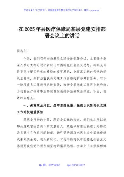 / 在2025年县医疗保障局基层党建安排部署会议上的讲话