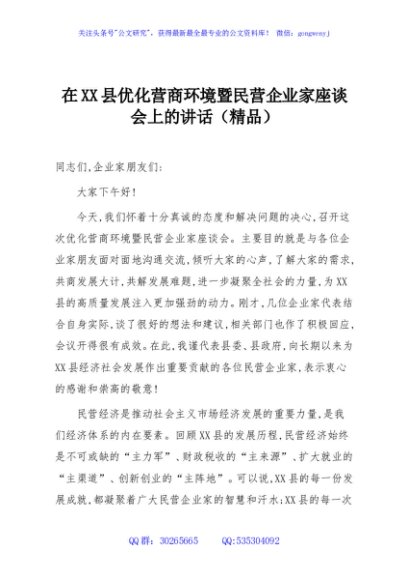 / 在XX县优化营商环境暨民营企业家座谈会上的讲话(精品)