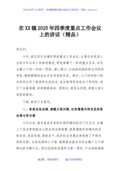 / 在XX镇2025年四季度重点工作会议上的讲话(精品)