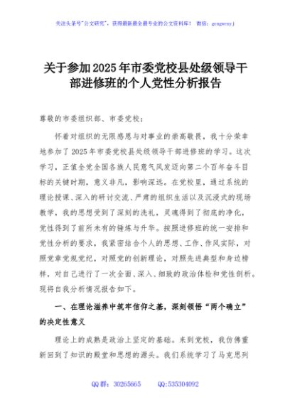 / 关于参加2025年市委党校县处级领导干部进修班的个人党性分析报告