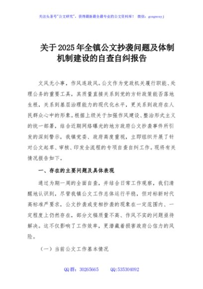 / 关于2025年全镇公文抄袭问题及体制机制建设的自查自纠报告