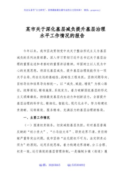 / 某市关于深化基层减负提升基层治理水平工作情况的报告
