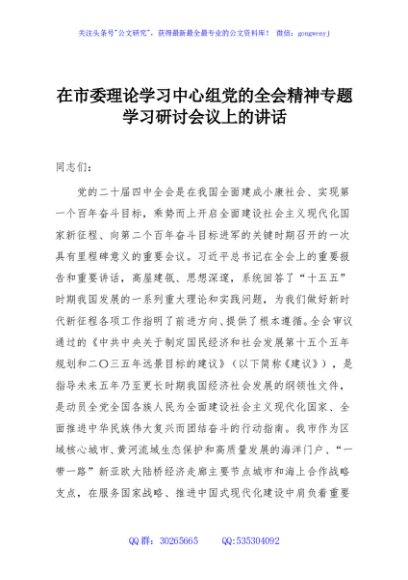 / 在市委理论学习中心组党的全会精神专题学习研讨会议上的讲话