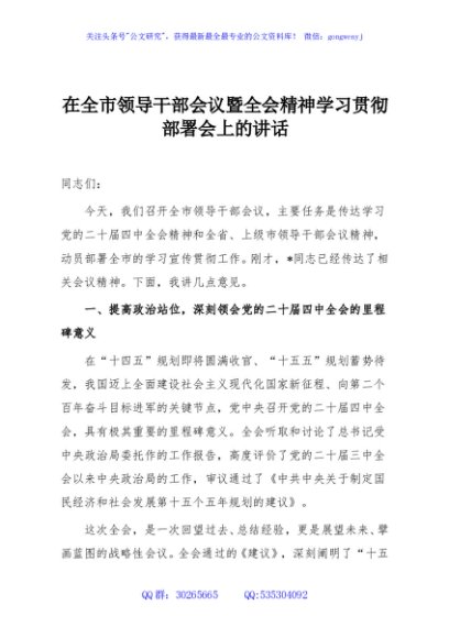 / 在全市领导干部会议暨全会精神学习贯彻部署会上的讲话